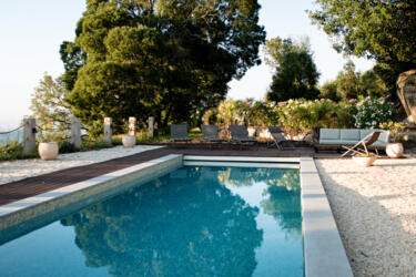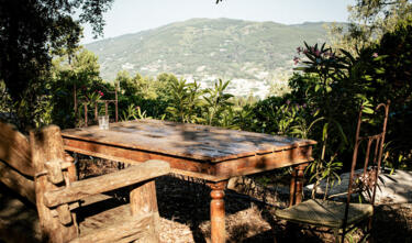 We practice every day in a beautiful yoga shala offering panoramic views through large windows that open to the beauty of the surrounding landscape. The lower part of the property is home to food forests, vegetable gardens, and untouched wild nature, while the upper area features a 15-meter pool where you can swim and soak in the sun in a deckchair.