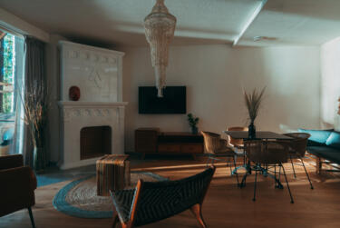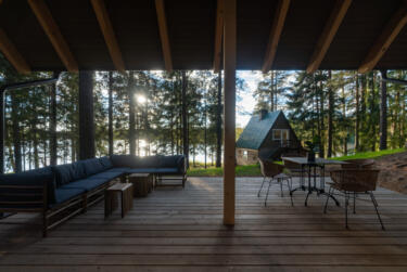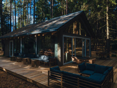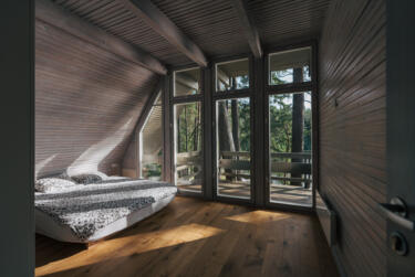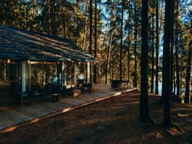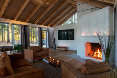 The rooms feature large, comfortable beds and big windows that fill the space with natural light and offer stunning views into the forest. Our cozy lounge and dining room with sofas and a fireplace invites you to snuggle up to read and unwind. Outside, wooden terraces with deck chairs and hammocks invite you to relax.