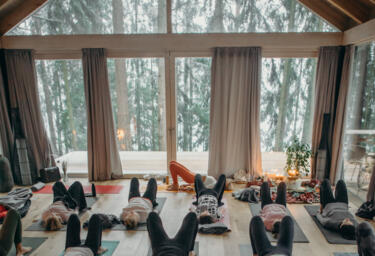 Our yoga shala, set amidst the trees, features 80 sqm of wooden floors and glass walls on all sides, so you feel immersed in the beauty of the forest as you practice.