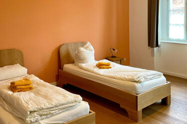 The atmosphere throughout is warm and inviting, blending traditional architecture with modern, elegant interior design. Each room is thoughtfully furnished, with well-restored bathrooms and single beds that can be arranged together for couples.