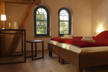 Breitenteicher Mühle consists of two beautifully restored buildings: the grand historic mill and the smaller miller’s house. The old mill offers six comfortable double rooms and three shared bathrooms, with two double rooms sharing each bathroom. In the miller’s house, you’ll find additional double rooms, including a large double room with a private bathroom, as well as a spacious shared room with four beds and its own bathroom.